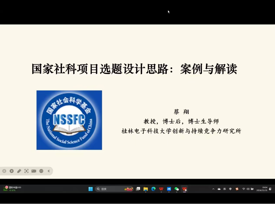 (通讯员 谢薇)为了帮助学院师生更好地理解国家社科项目的申报要求,提升选题质量,推动科研创新与学科发展。10月31日19:00,永利总站官网通过腾讯会议举行了长江经管讲坛第六十五讲,桂林电子科技大学软科学研究院副院长蔡翔受邀宣讲,针对国家社科项目的选题设计思路进行了全面而深入的解读。ylzzcom永利总站线路检测副院长裴潇、教师代表、2023级和2024级研究生到场参会。本次会议由副教授周欣星主持。
