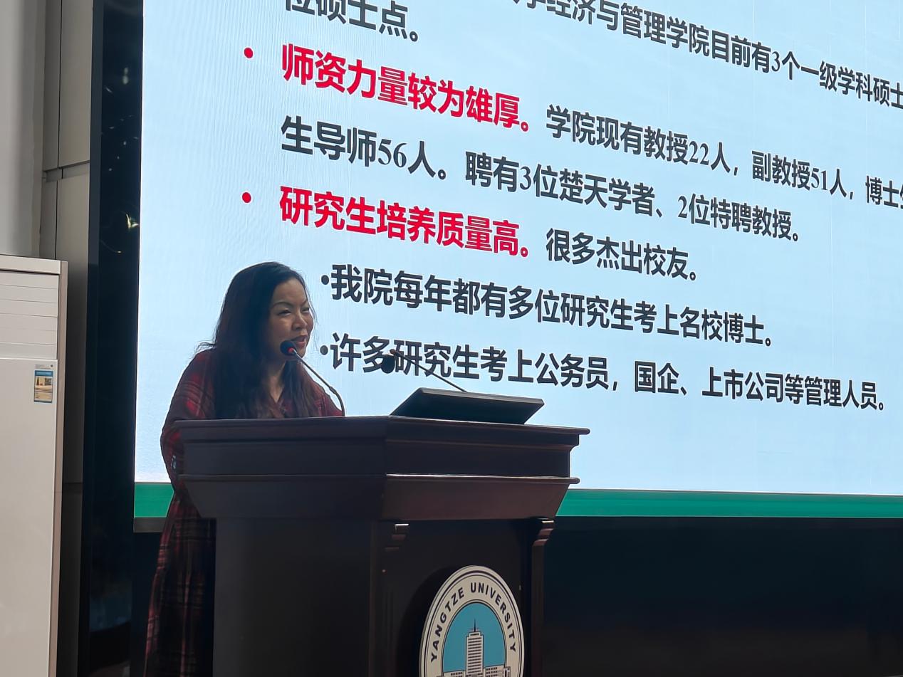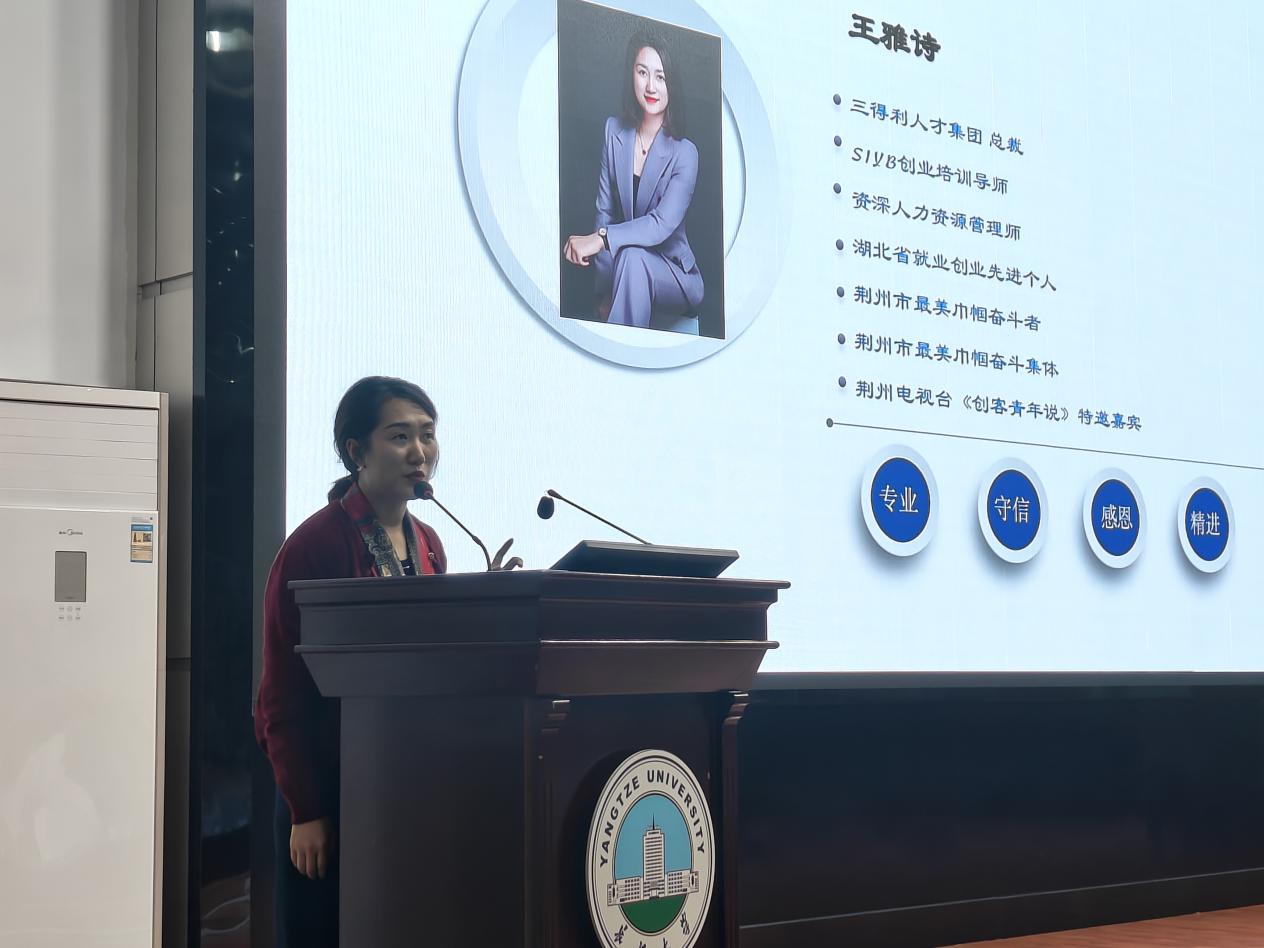 王雅诗以“‘职’引未来‘就’在荆州”为题,为与会同学开展了就业指导,她着重介绍了当前就业形式和心理、企业具体情况、招聘面试技巧及荆州的就业创业政策,帮助同学们更好地理解目前企业的运作模式、团队合作精神和创新理念,激发了他们对未来工作的期待和热情。