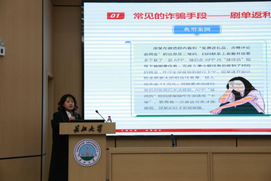 胡素君介绍自己是15届毕业生,目前就职于深交所。她则侧重讲解我们生活中容易碰到的诈骗套路,盘点了电影《孤注一掷》背后的连环圈套和常见的“刷单式”交易,深刻解读防非反诈案例,助力护航金融安全,维护投资者的权益。她希望同学们要在内心时刻敲响警钟,无论是在日常生活中还是未来的就业岗位上,遇到类似场景要提高警惕擦亮双眼。
